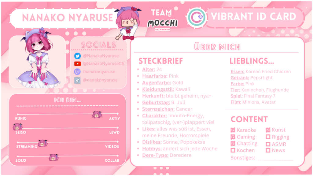 In der zauberhaften Welt von Vibrant bildet Nanako das bezaubernde Team Mocchi! Unter ihrer liebevollen Führung wird Team Mocchi zu einem einzigartigen Safespace innerhalb der Gemeinschaft. Mit besonderem Augenmerk auf die Bedürfnisse derjenigen, die nach Anschluss in der Szene suchen oder ein Gefühl der Zugehörigkeit brauchen, schafft Nanako mit ihrem Team ein warmes und gemütliches Umfeld.